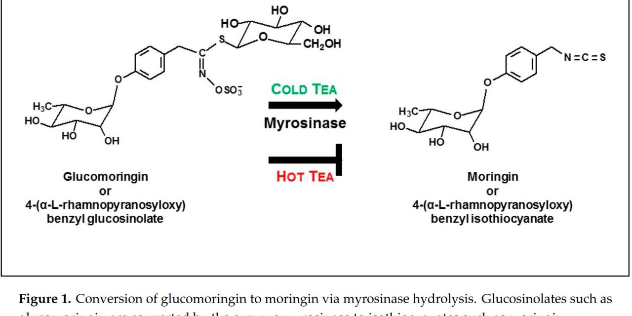These teas can be easily and reproducibly prepared in underserved tropical regions of the world where moringa is cultivated. Isothiocyanate yield from a cold extraction was rapid and essentially complete after 30 min and its anti-inflammatory potential is comparable to that of equimolar purified moringin. A preparation similar to this may be safe to consume with respect to its bacterial titer even after 48 h without refrigeration. Thus, facile delivery of moringa tea to both adults and children for clinical